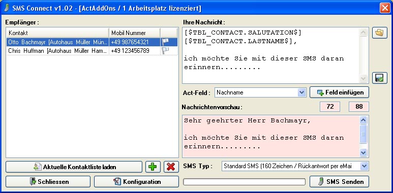 SMS Connect verschickt normale und personalisierte Einzel- und Serien-SMS direkt aus ACT heraus. Schicken Sie Ihren Kunden direkt Ihre Kontaktinformationen oder eine Erinnerung an den nächsten Termin.