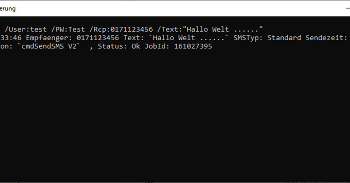 Bsp.: cmdSendSMS /User:test /PW:Test /Rcp:0171123456 /Text:"Hallo Welt ......"