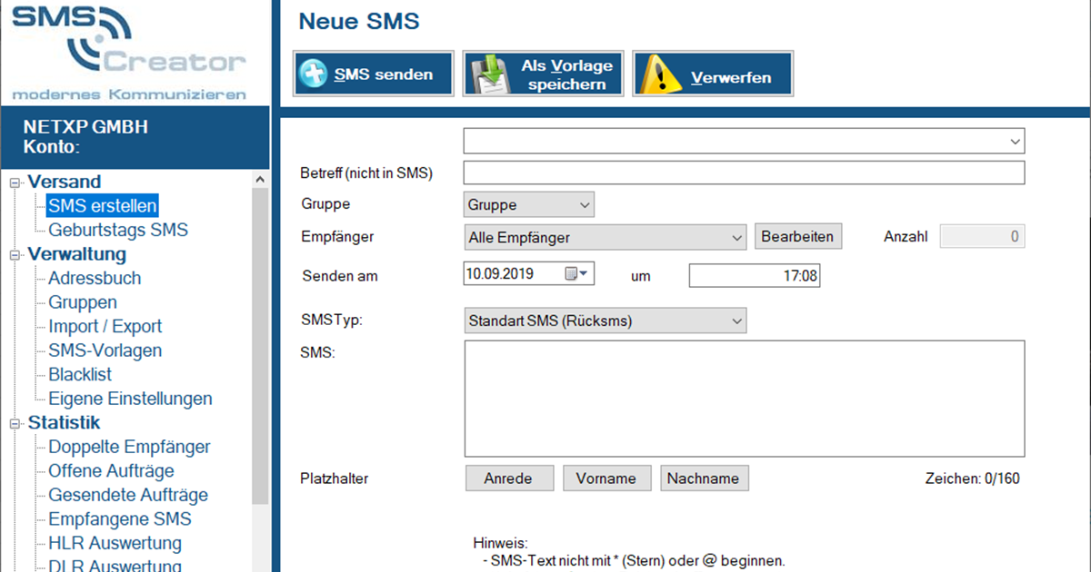 Bei dem eigentlichen Versand der SMS stehen Ihnen auch zahlreiche Hilfsmittel zur Verfügung, um Ihnen die Arbeit so einfach wie möglich zu gestalten. So können Sie SMS-Texte als Vorlagen speichern, um sie bei dem nächsten Versand wieder benutzen zu können. Auch können Sie den verschiedenen Aufträgen Namen geben, um sie später wieder zuordnen zu können.